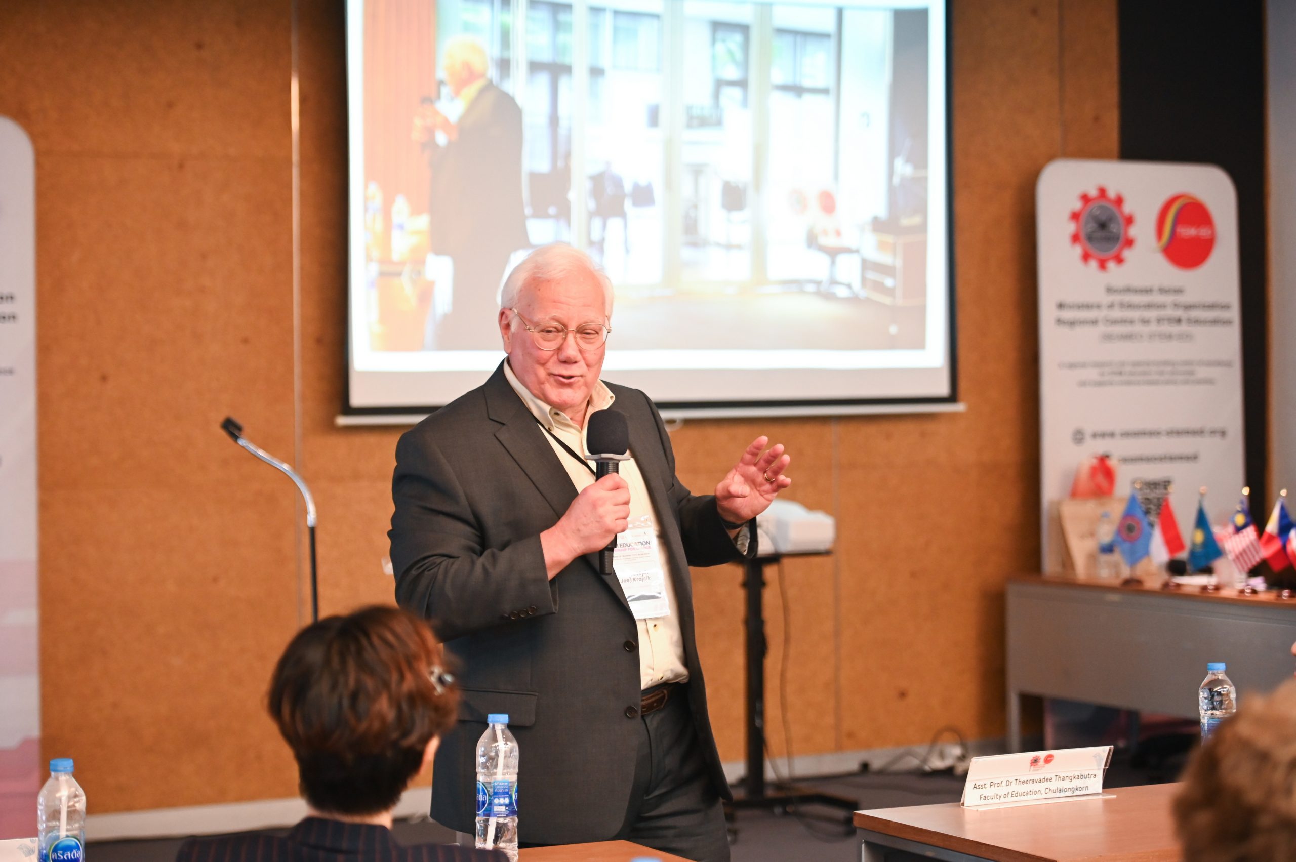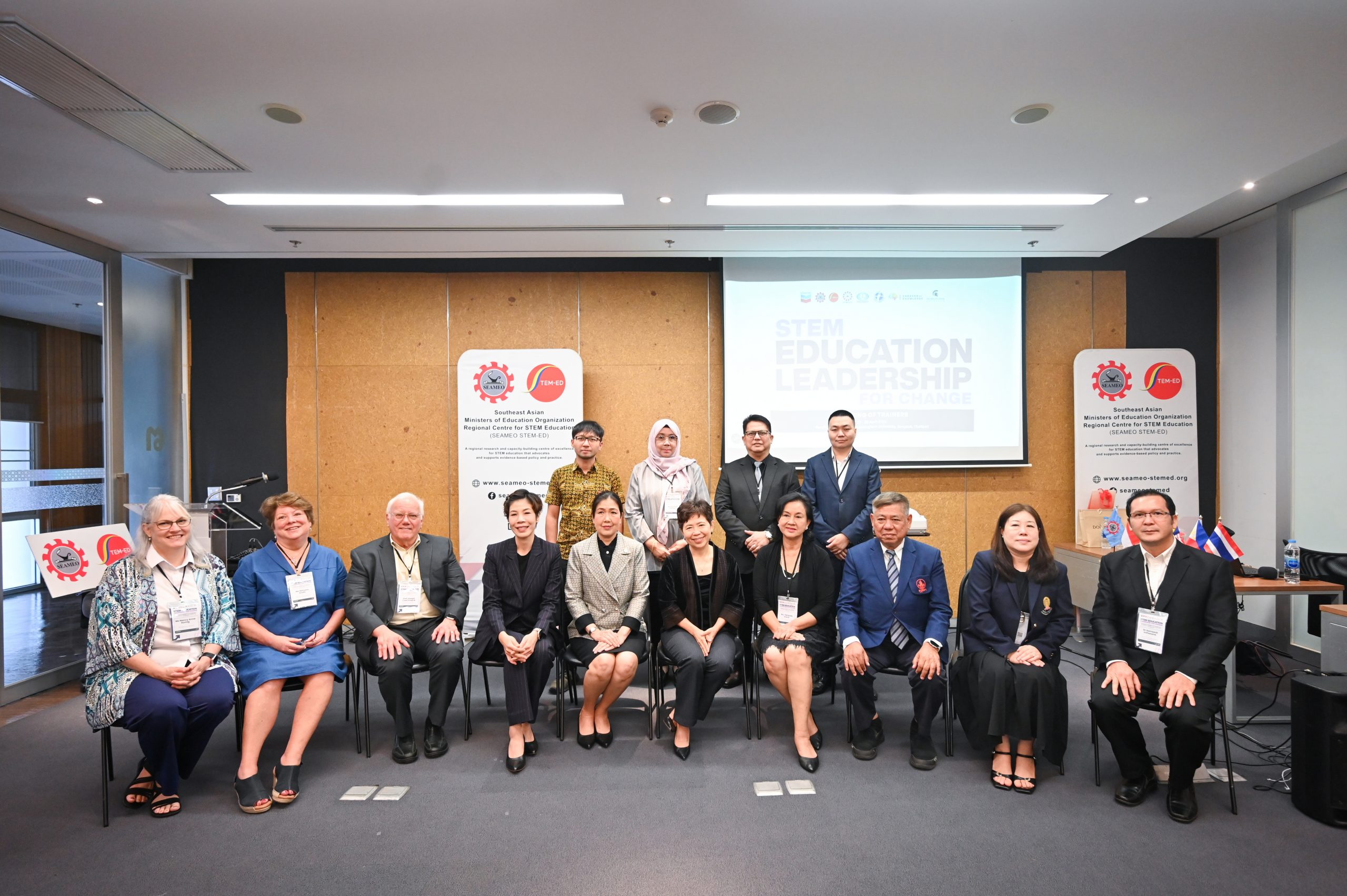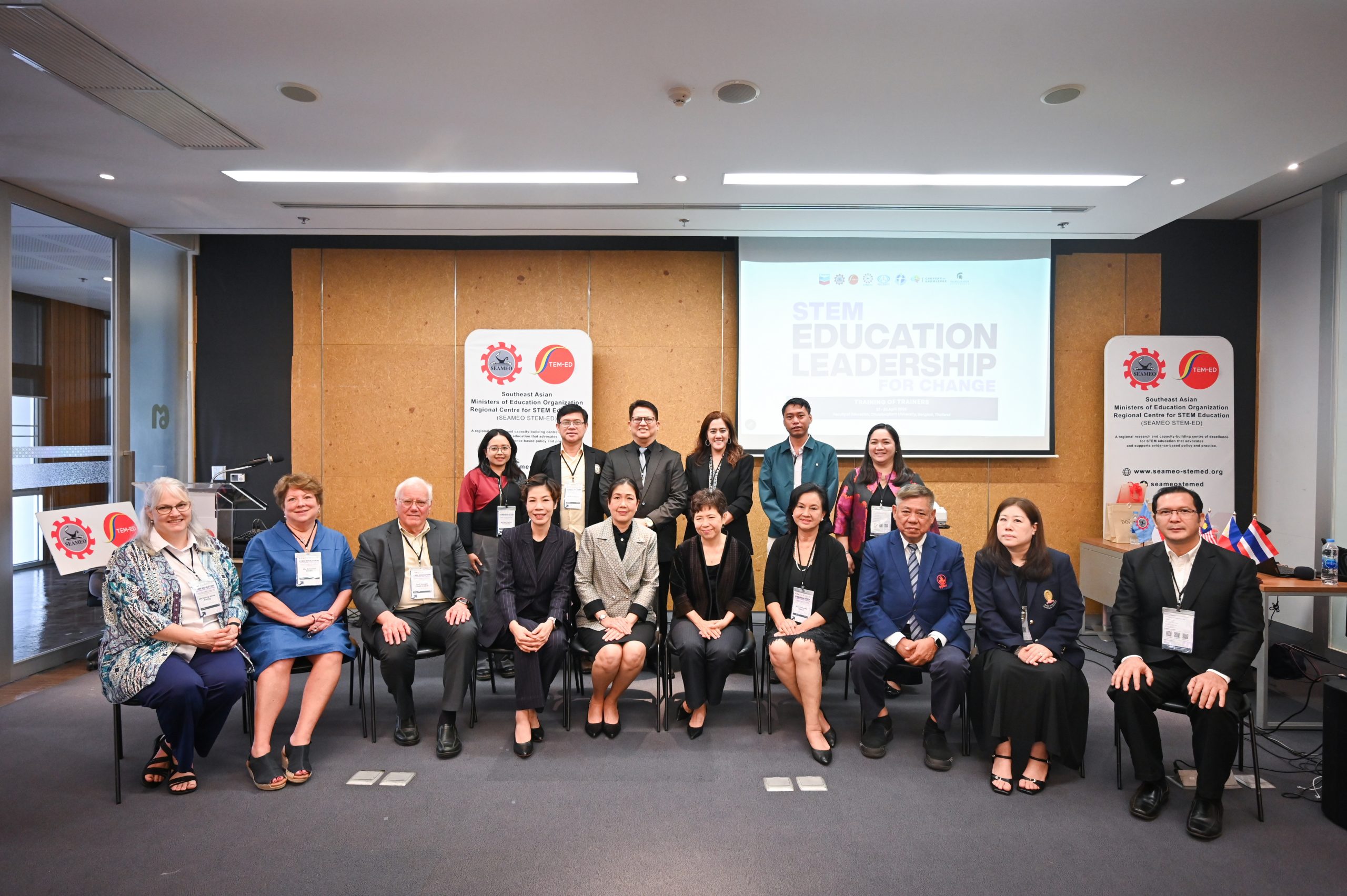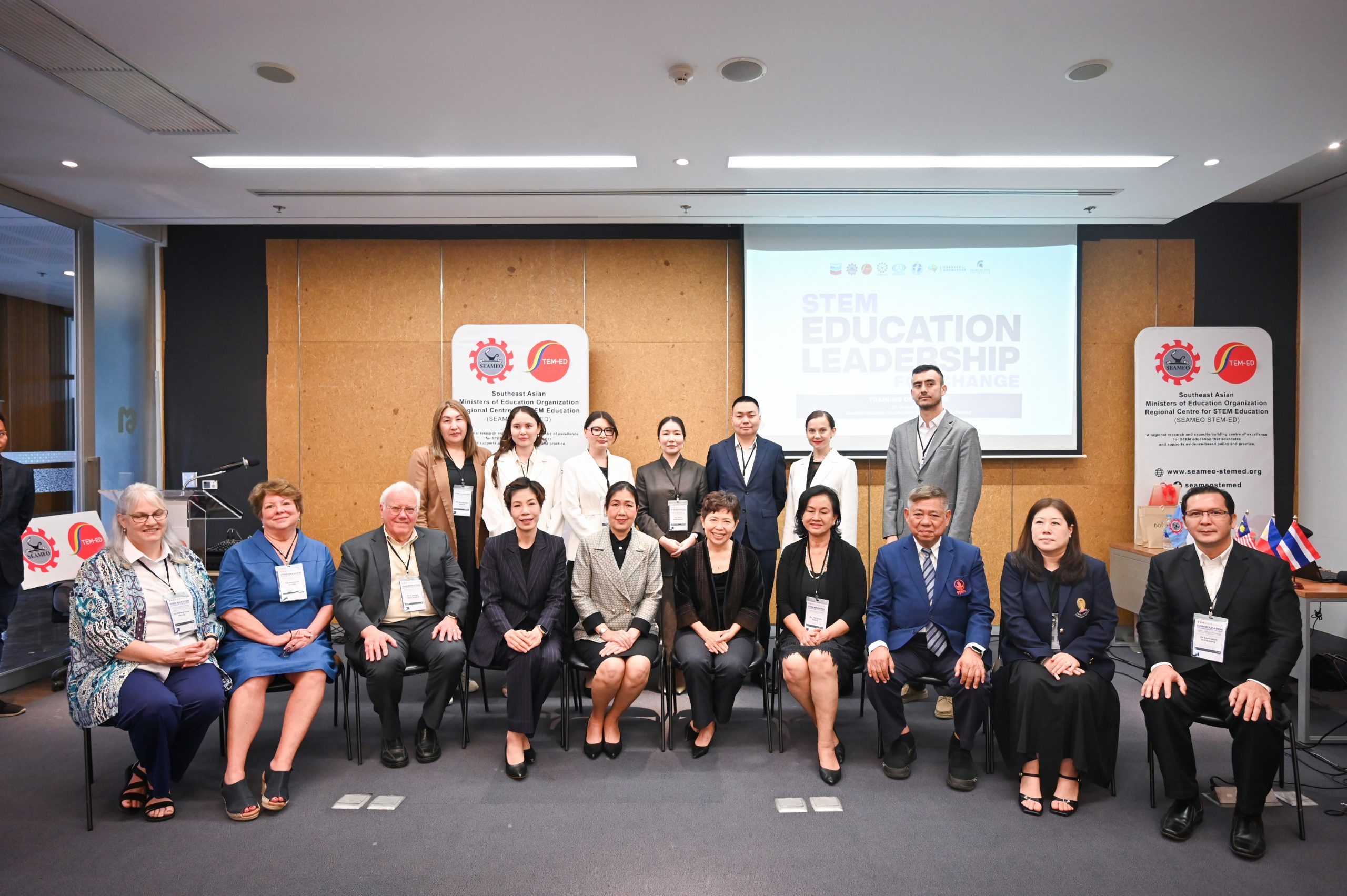 Participants include representatives from SEAMEO STEM-ED, SEAMEO INNOTECH, SEAMEO RECSAM, SEAMEO SEAMOLEC, and Caravan of Knowledge, alongside officials from Thailand’s Ministry of Education agencies, including OBEC, IPST, ONESQA, the Teachers’ Council of Thailand, and the Bureau of International Cooperation, Office of the Permanent Secretary. University partners from across Thailand are also participating, including Chulalongkorn University, Kasetsart University, Khon Kaen University, Naresuan University, Thaksin University, King Mongkut’s University of Technology Thonburi, Mahasarakham University, Chiang Mai University, Phuket Rajabhat University, and Asian Institute of Technology, together with international collaborators from Michigan State University, STEM Teachers NYC, the UNESCO Office for Climate Education, and Chevron as well as invited guests from the Princess Maha Chakri Award (PMCA) Foundation and Junior Achievement Thailand.