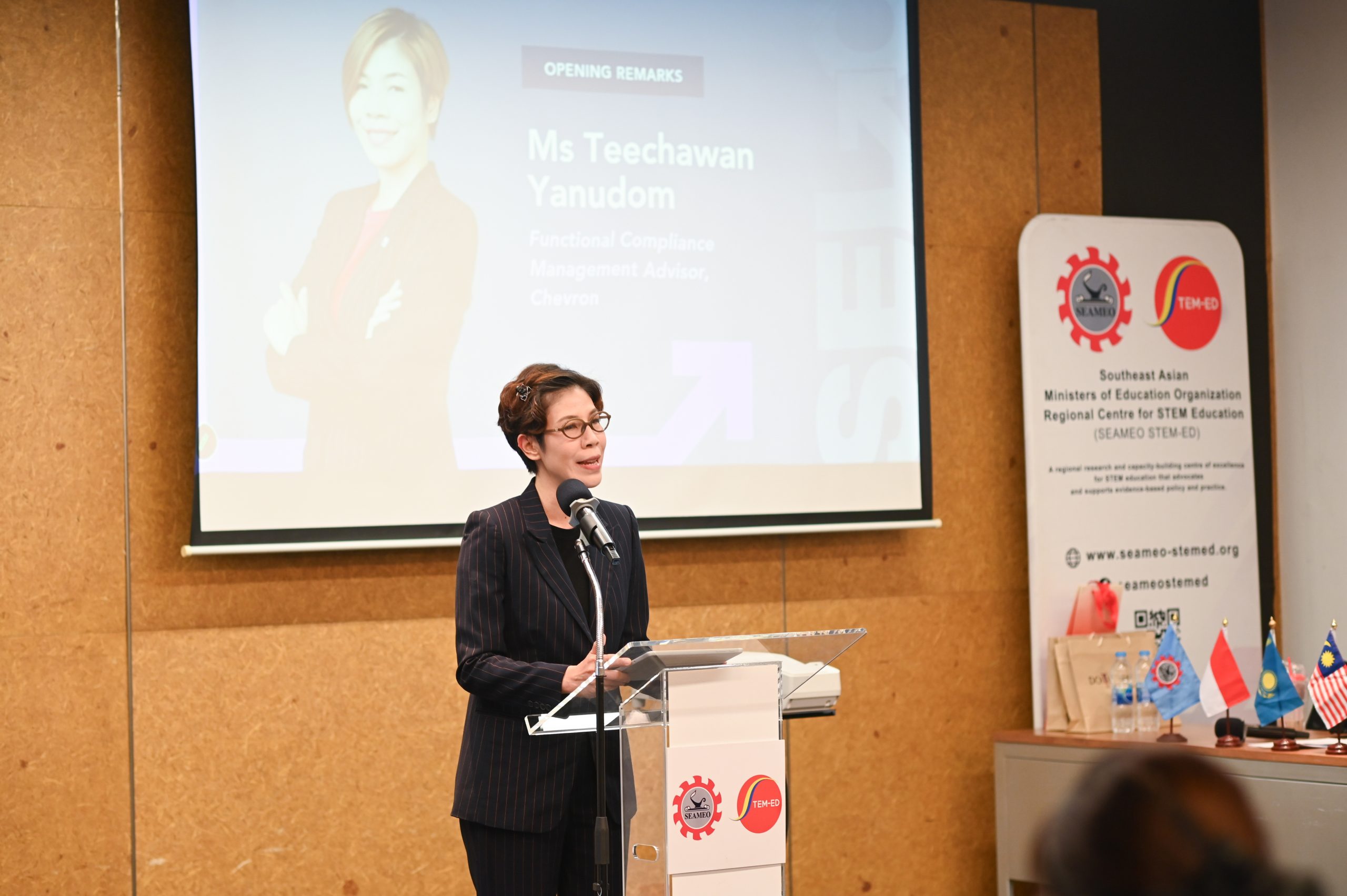 Representing the programme’s funding partner, Ms Teechawan Yanudom, Functional Compliance Management Advisor at Chevron, reaffirmed the company’s commitment to advancing STEM education as a means of equipping young people with essential problem-solving skills for the future. She highlighted Chevron’s nearly seven-year partnership with SEAMEO STEM-ED in strengthening institutional capacity, promoting evidence-based policy, and fostering a regional professional learning community. She noted that the STEM Education Leadership for Change Programme builds on these foundations by emphasising the critical role of instructional leadership, alignment with quality assurance systems, and the engagement of both school leaders and policymakers to ensure sustainable and scalable impact across education systems.
